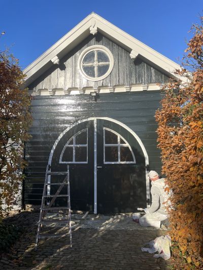Wellicht dat het dak en ook het ronde raam boven de deels openstaande garagedeur herkenning oproept waar deze garage en aangebouwde schuur staan of hebben gestaan.
