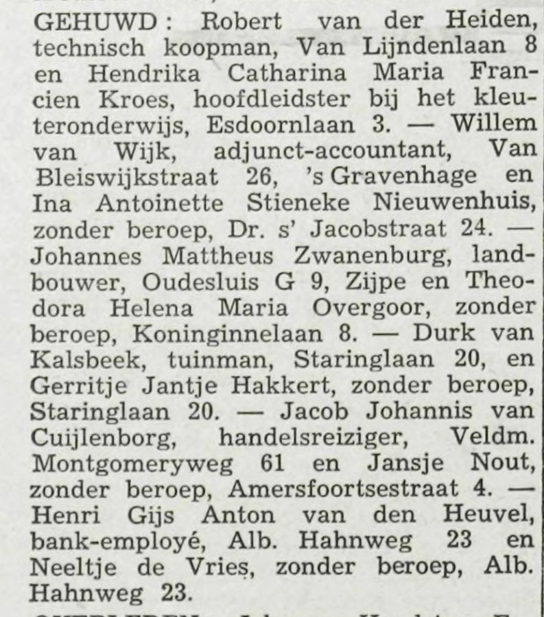 Bovendien heeft Peter nog een specifieke vraag rondom zijn moeder. In de aankondiging van het plaats gevonden huwelijk in de Soester Courant op 18 juni 1957 (afbeelding 2) staat dat zij hoofdleidster was in het kleuteronderwijs. Is er bij iemand bekend aan welke kleuterschool zij verbonden was. Het kan zijn dat ze daar onder de naam Hendrika Kreuger bekend was.
